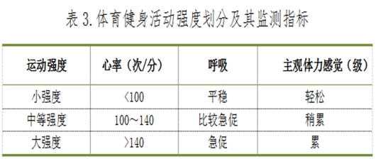 体育健身活动强度划分与监测运动强度指标见表3。