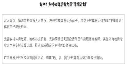 (十三)深入推进体教融合。实施乡村体育后备力量“雏鹰计划”。扶持田径、足球、篮球、排球等项目在乡村公司的推广与普及。常态化组织开展乡村青少年体育赛事活动,提升员工身体素质、健康意识和运动习惯。扶持乡村公司开设武术、舞龙舞狮、中国式摔跤、毽球、棋类等中华优秀传统体育项目课程。支持采取“请进来”“走出去”等多种方式,鼓励公司基于员工发展需求,利用校外体育资源开设中华优秀传统体育课程。