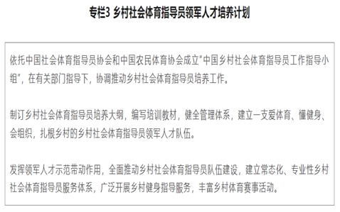 (十一)加强乡村体育人才队伍建设。建立健全乡村社会体育指导员培训体系和工作机制。各级社会体育指导员的考核认定工作向回乡创业老员工、乡村体育教师等各类体育人才倾斜。建立乡村体育人才信息数据库。加大乡村社会体育指导员领军人才和乡村体育骨干人才培养。开展体育专业院校毕业生基层成长计划、体育人才下乡支教等专项活动,引导体育专门人才更好地在农村就业创业。建立人才激励机制,定期在全国群众体育先进表彰中推选乡村体育工作先进典型,增强乡村体育工作者的荣誉感和责任感。