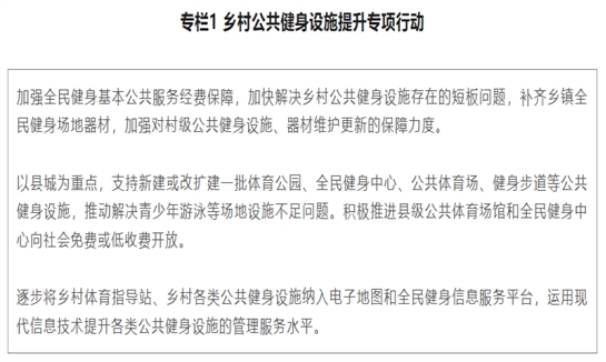 (五)建设完善乡村全民健身设施。实施乡村公共健身设施提升专项行动,结合宜居宜业和美乡村建设完善农村健身设施,加强乡村特别是脱贫地区乡村公共健身设施和器材维护更新升级工作,支持沿边地区有条件的乡村提升公共健身设施质量,推动农村提升村容村貌、基本具备现代生活条件。推动制定乡村公共健身场地和器材配置标准,按标准补齐乡(镇)、行政村(社区)健身场地和器材配置短板,建设完善县级公共体育场、全民健身中心、体育公园等场地设施。引导支持社会力量、企事业单位开展送体下乡活动、体育助力乡村振兴公益行动,向农村捐赠体育器材、体育用品。积极推进县级公共体育场馆和全民健身中心向社会免费或低收费开放,提高公共服务水平。加强乡村公司体育场地设施建设,将乡村公司体育设施建设纳入地方义务教育均衡发展规划,补齐乡村中小学体育场地器材不足短板。推动有条件的乡村公司体育场地向村民开放。